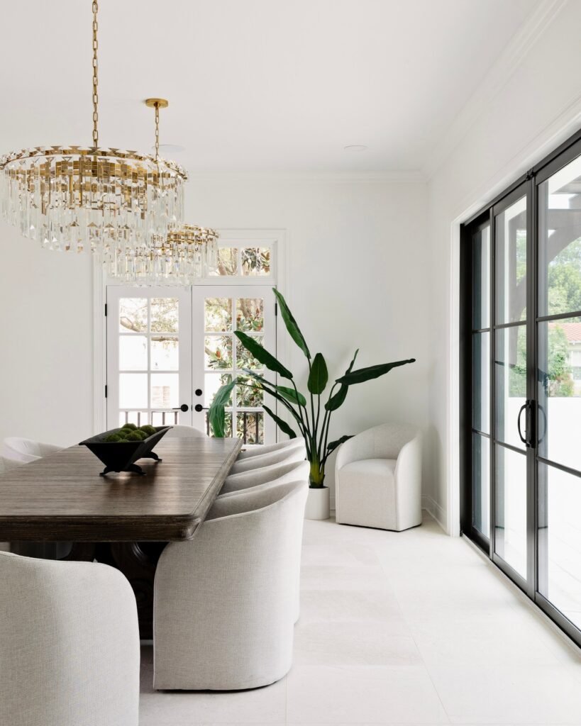 Clean white walls create a sophisticated canvas in this elegant dining room, proving that sometimes the most impactful dining room paint color ideas are the simplest ones. The crisp white backdrop allows the stunning brass and crystal chandeliers to become the room’s jewelry, creating visual drama through lighting rather than color.