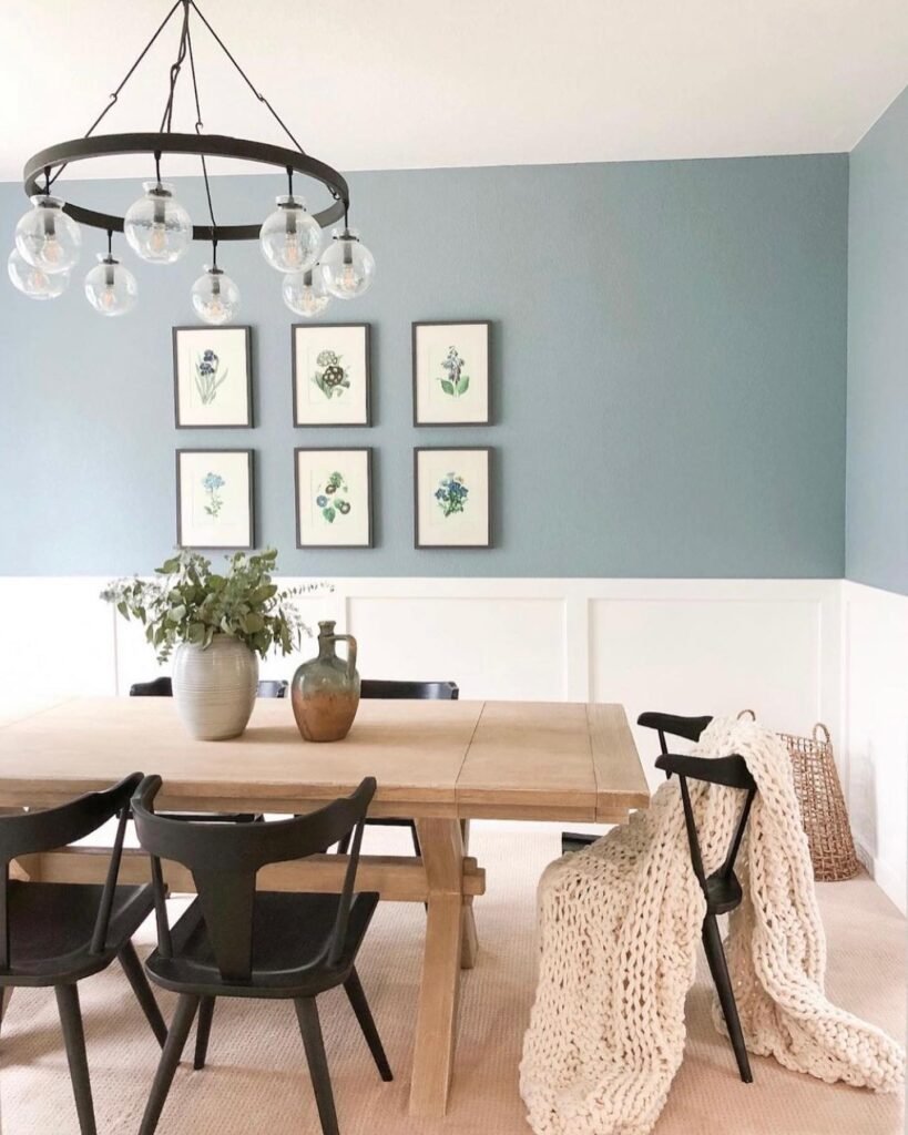 This dining room paint color idea combines the calming effects of blue with enough gray undertones to feel sophisticated rather than childish. White wainscoting provides classic contrast and visual interest.
