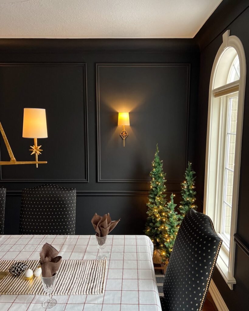 Deep charcoal walls create an intimate, cocoon-like atmosphere in this sophisticated dining nook. This dining room paint color idea proves that dark hues can make small spaces feel cozy rather than cramped. The rich color provides a stunning backdrop for warm brass lighting and seasonal decorations.