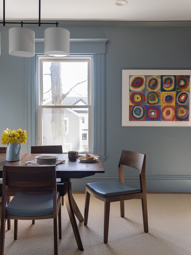 This dining room paint color idea works beautifully in smaller spaces or areas with limited natural light. The soft blue undertones make the room feel fresh and airy, while the gray keeps it sophisticated.