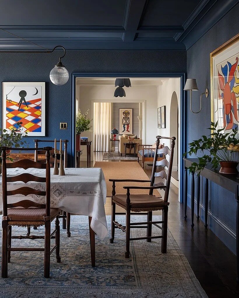 Navy blue walls create instant sophistication in this striking dining room. This dining room paint color idea demonstrates how dark hues can make a space feel cozy rather than cramped. The rich blue backdrop allows colorful artwork to pop dramatically, creating a gallery-like atmosphere for entertaining.