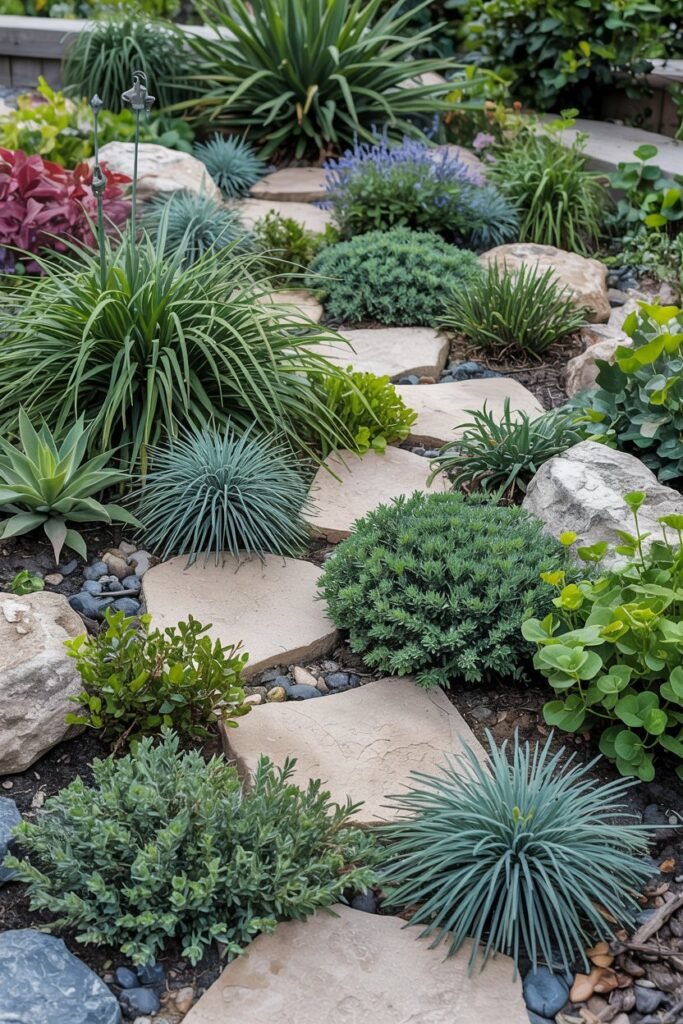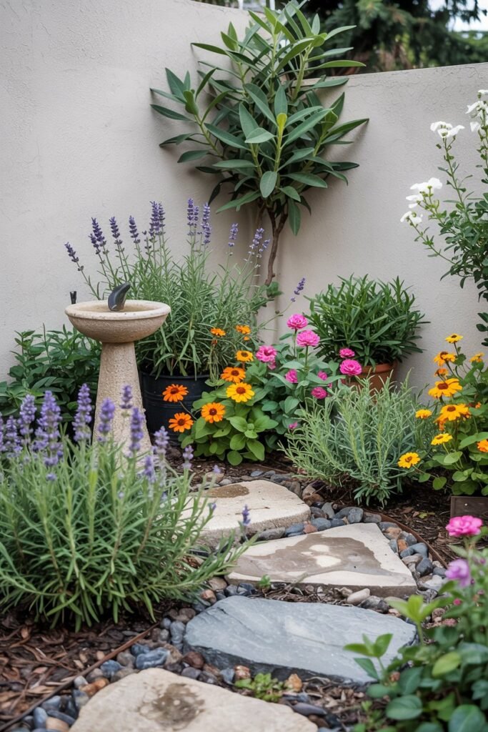 The secret is using gravel as mulch around these plantings. It retains moisture while allowing excellent drainage that Mediterranean plants crave. I add stepping stones to create pathways and a small birdbath as a focal point.