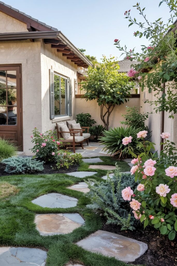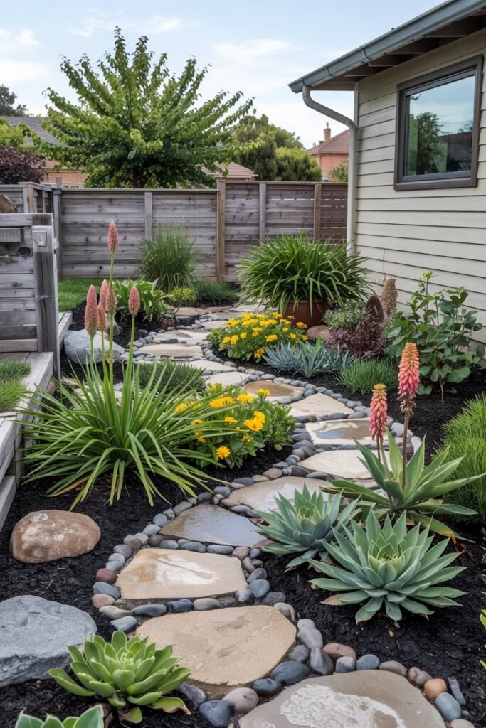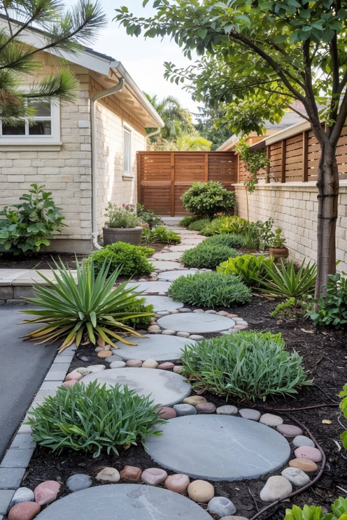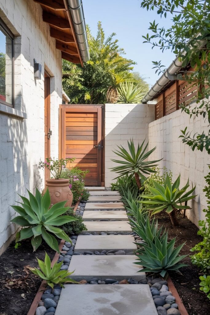 I never overlook narrow side yards—they’re perfect for drought-tolerant makeovers. I use concrete slabs or pavers for walking surfaces, then edge with dwarf mondo grass, agave, and New Zealand flax.