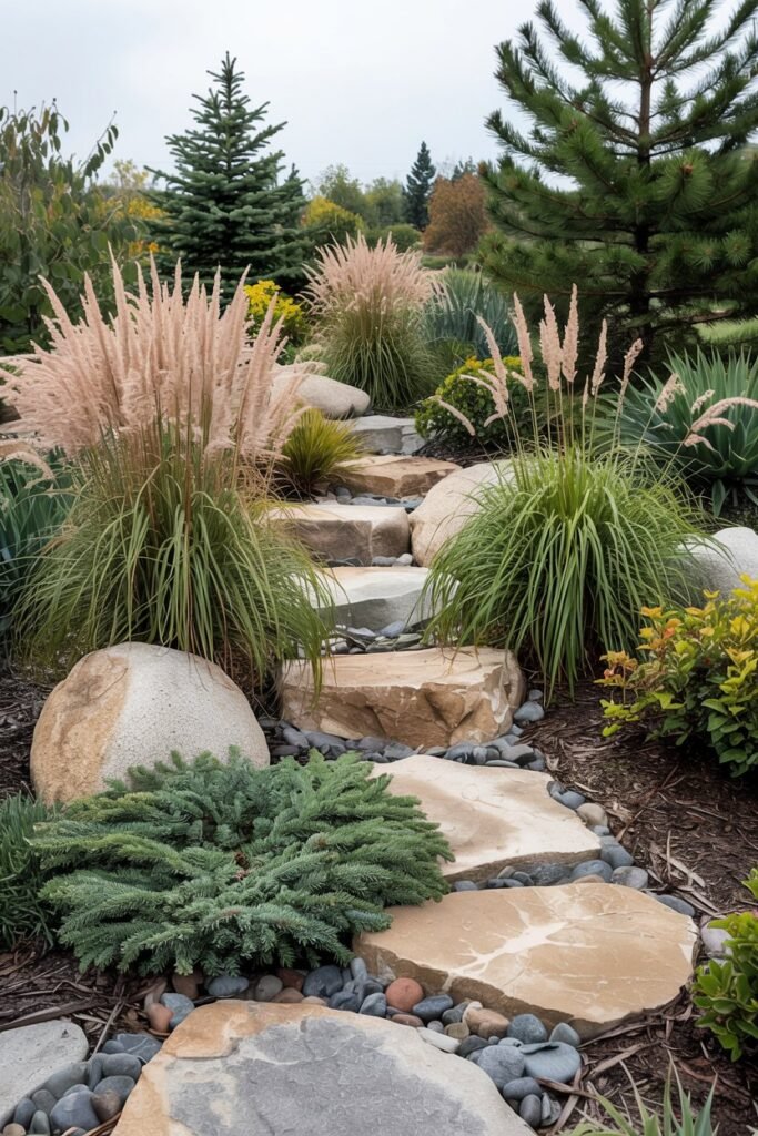 Sometimes I keep things beautifully simple with just a few large boulders, evergreen spruce, and ornamental grasses. Pink muhly grass is particularly stunning when it blooms in fall.