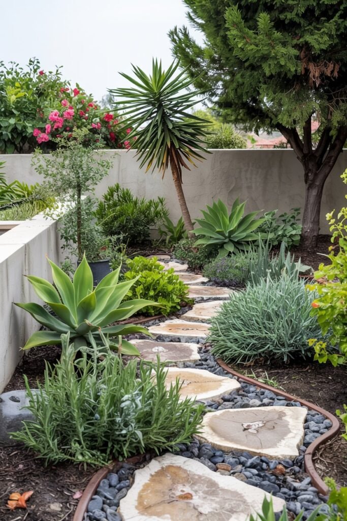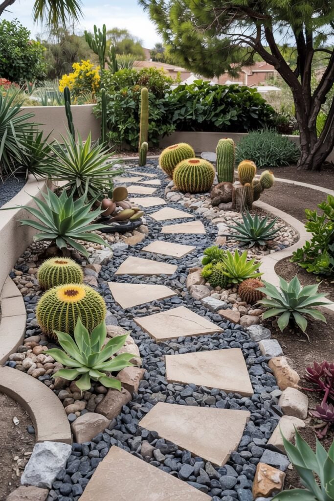 I’m fascinated by xeriscaping because it mimics natural desert beauty. I use water-permeable gravel surfaces with stepping stones, then plant various cacti, agave, and Mediterranean natives throughout.