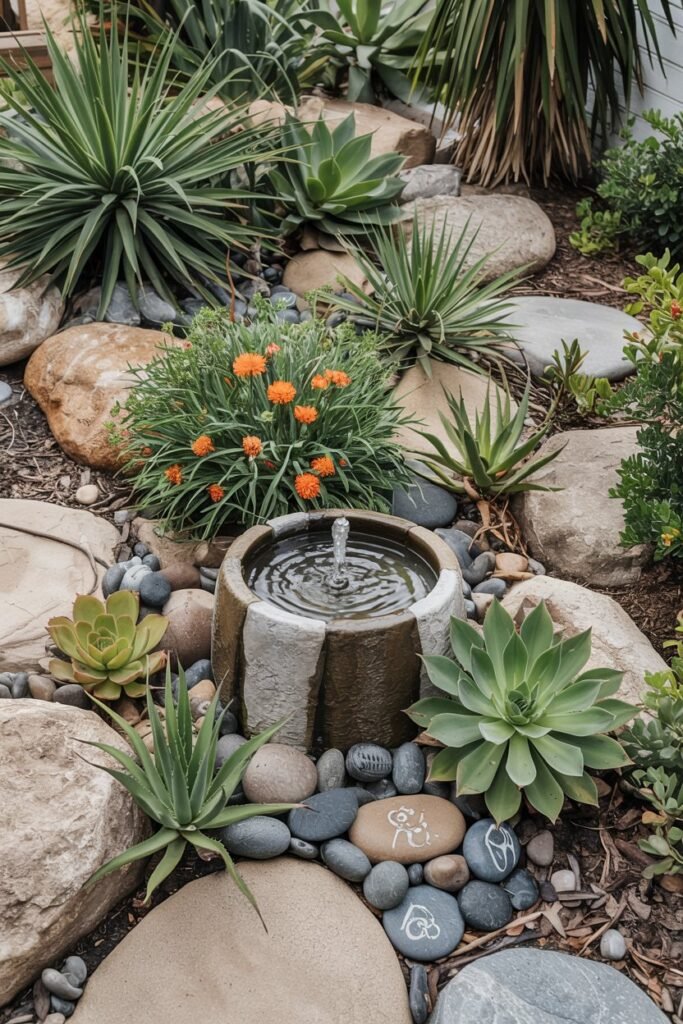 The water feature doesn’t need to be large—even small fountains provide the soothing sound of water while attracting birds. River rock around the feature ties everything together naturally.