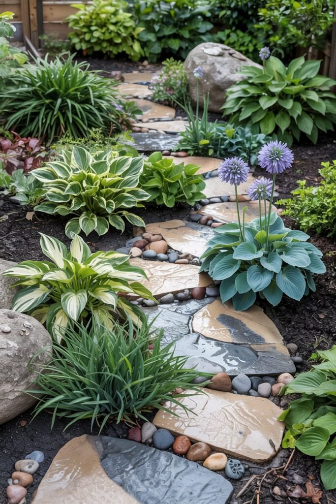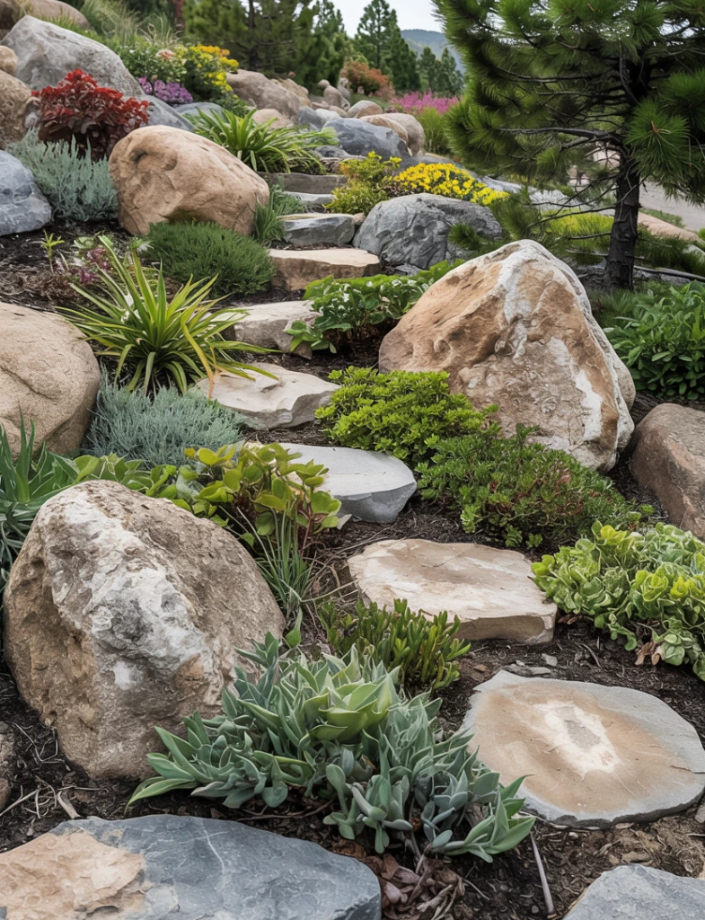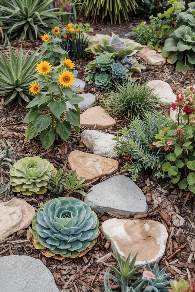 The rocks provide afternoon shade for more delicate plants while storing heat for cool mornings. I plant creeping thyme, sedum varieties, and small ornamental grasses in the spaces between stones.