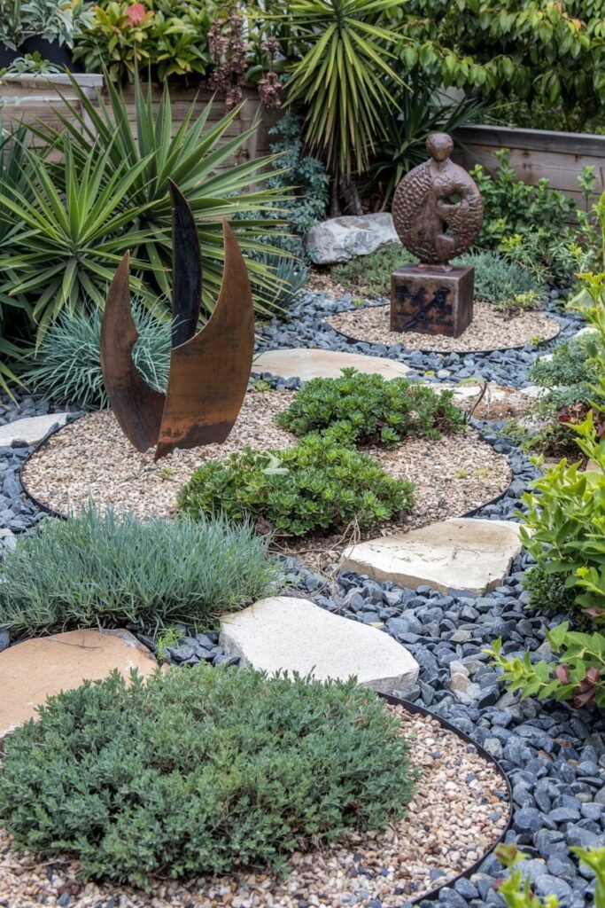 I love adding sculptures to drought-tolerant gardens because they provide year-round interest without requiring water. I use contemporary metal pieces or natural stone sculptures as focal points, surrounded by gravel and drought-tolerant ground covers.