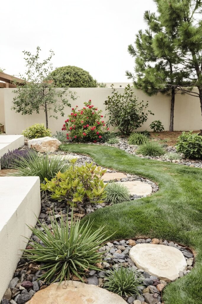 Rock mulch around the plantings conserves moisture while creating clean lines. I particularly love this approach because it maintains some green space for activities while dramatically reducing water needs and maintenance.