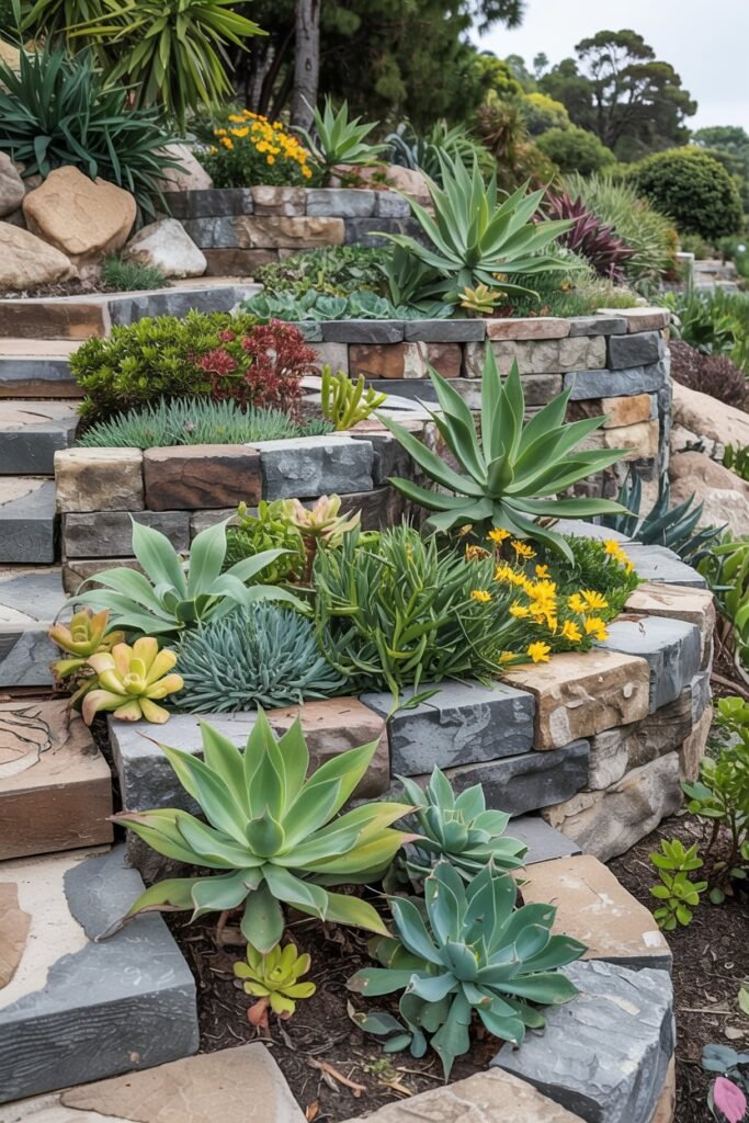 For sloped areas, I create terraces using retaining walls and fill them with drought-tolerant plants. I use variegated agave as anchor plants, then fill in with low-growing portulaca, ice plant, and various sedum varieties.