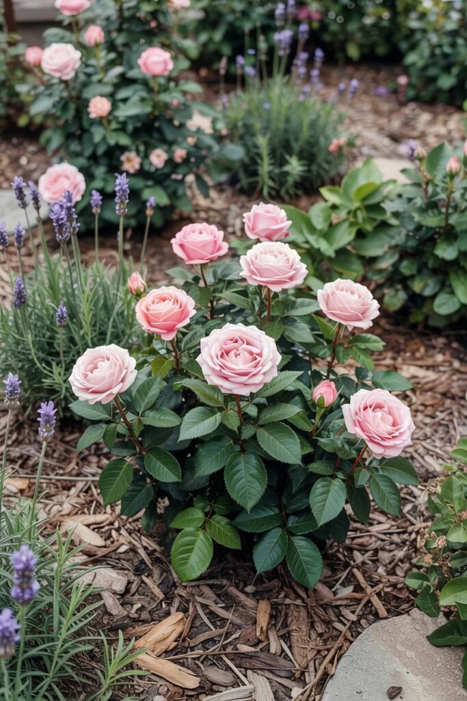 These newer rose varieties are incredibly drought-tolerant once established. The lavender provides structure and attracts beneficial insects while requiring minimal water.