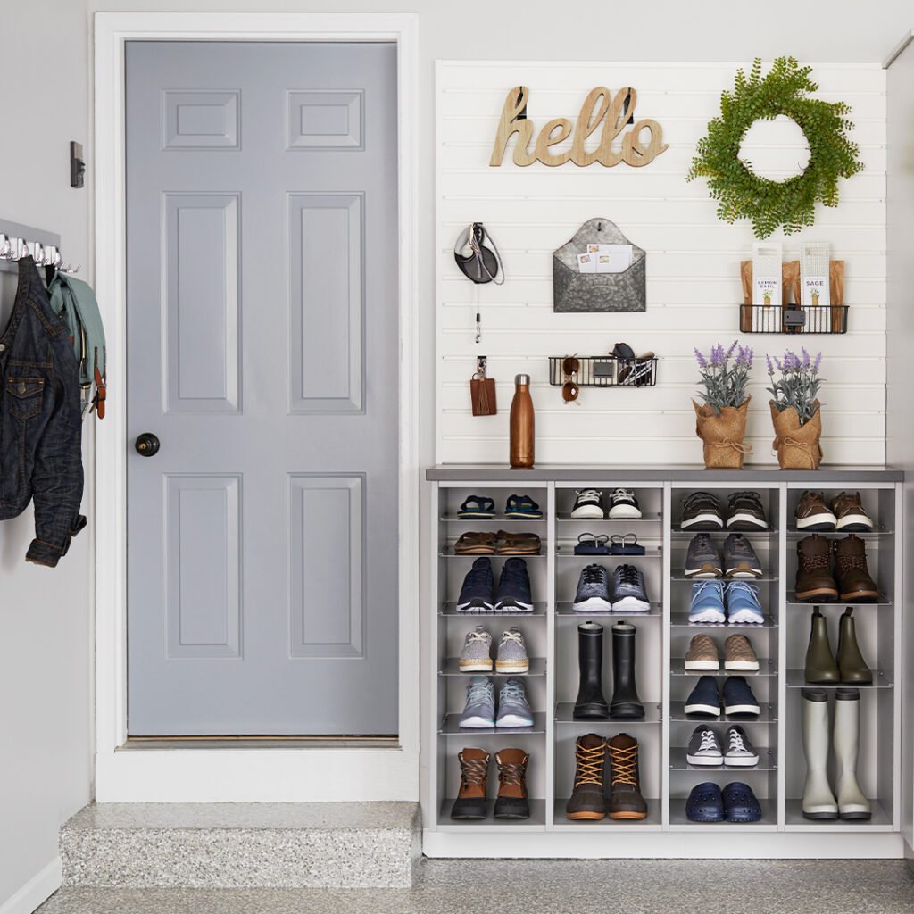 Decorative elements like the wreath and “hello” sign prove that functional entryway storage can still be welcoming and stylish. This setup works particularly well for large families or anyone with an extensive shoe collection.