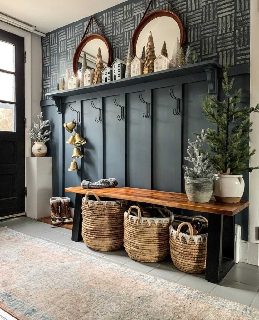 Large woven baskets below provide ample storage for boots, umbrellas, and seasonal accessories. The floating shelf above offers display space for seasonal decorations or everyday essentials. Natural wood bench seating brings warmth to the otherwise moody palette.