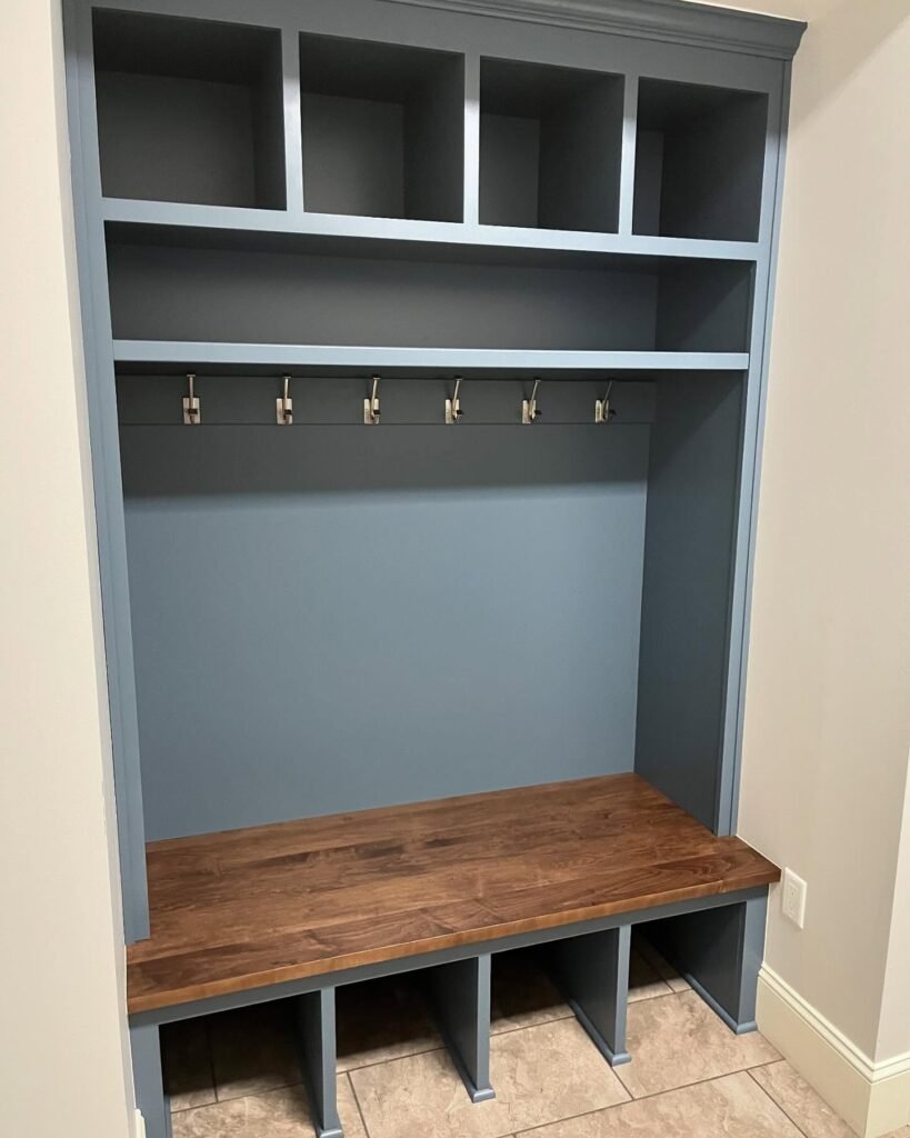 Upper cubbies provide dedicated spaces for hats, gloves, and seasonal accessories. The lower bench section features four roomy compartments for boots, shoes, and sports equipment. This built-in approach maximizes every inch of available wall space.