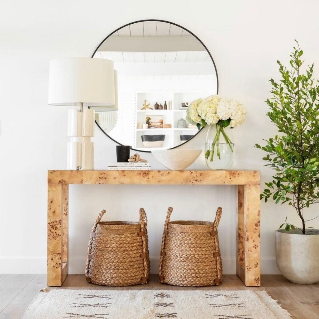 Fresh flowers and greenery soften the rustic elements, creating balance between function and beauty. The round mirror reflects light throughout the space, making smaller entryways feel more spacious. This combination of textures feels both modern and timeless.