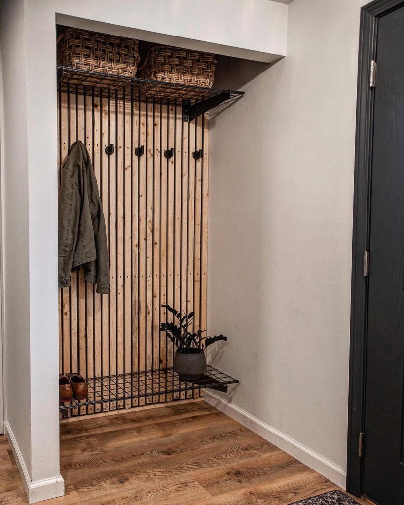 Smart entryway storage ideas like this work especially well in farmhouse or industrial-style homes where authenticity matters more than perfection.