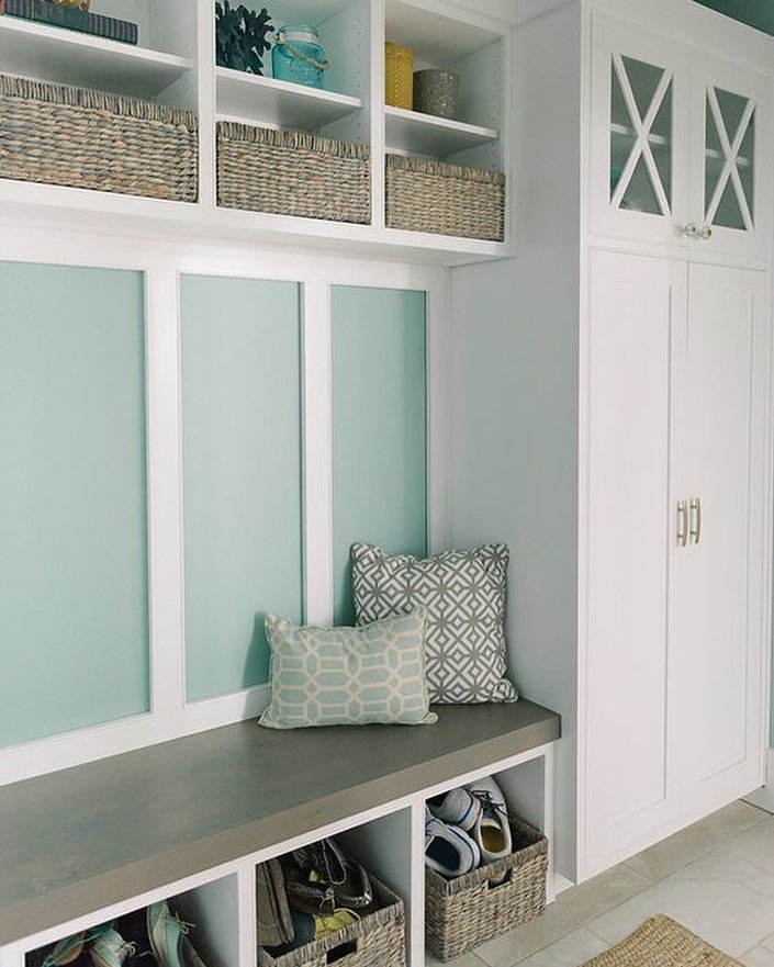 This seafoam green entryway storage design brings tranquil coastal vibes to your daily routine. The soft mint color palette creates a calming atmosphere right at your front door. Built-in bench seating offers comfort while putting on shoes or waiting for rides.
