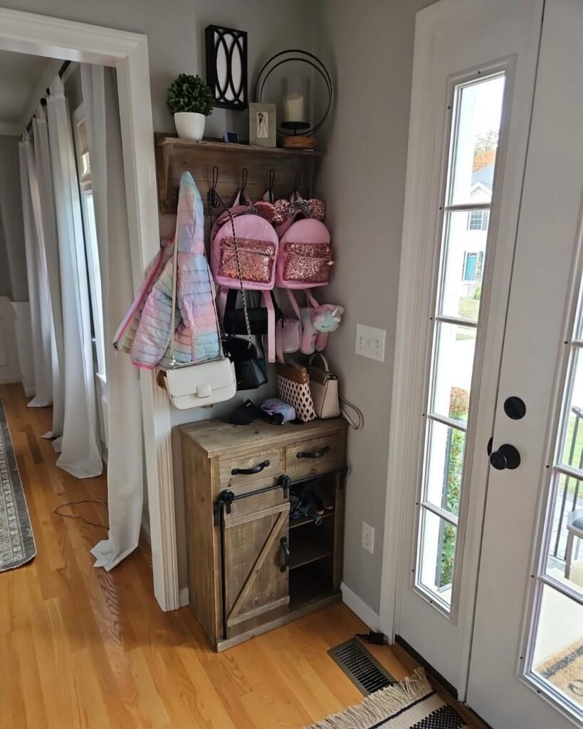 This clever corner entryway storage design makes the most of often-wasted space. The rustic wooden cabinet with sliding barn door hardware adds farmhouse charm while hiding clutter. Upper hooks keep backpacks and bags easily accessible for school-age children.