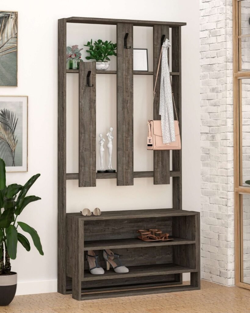 Weathered wood creates instant character in this all-in-one entryway storage solution. The tall frame provides multiple hanging spots for coats, bags, and scarves, while decorative shelving displays plants and personal items. The lower bench section organizes shoes with easy access compartments.