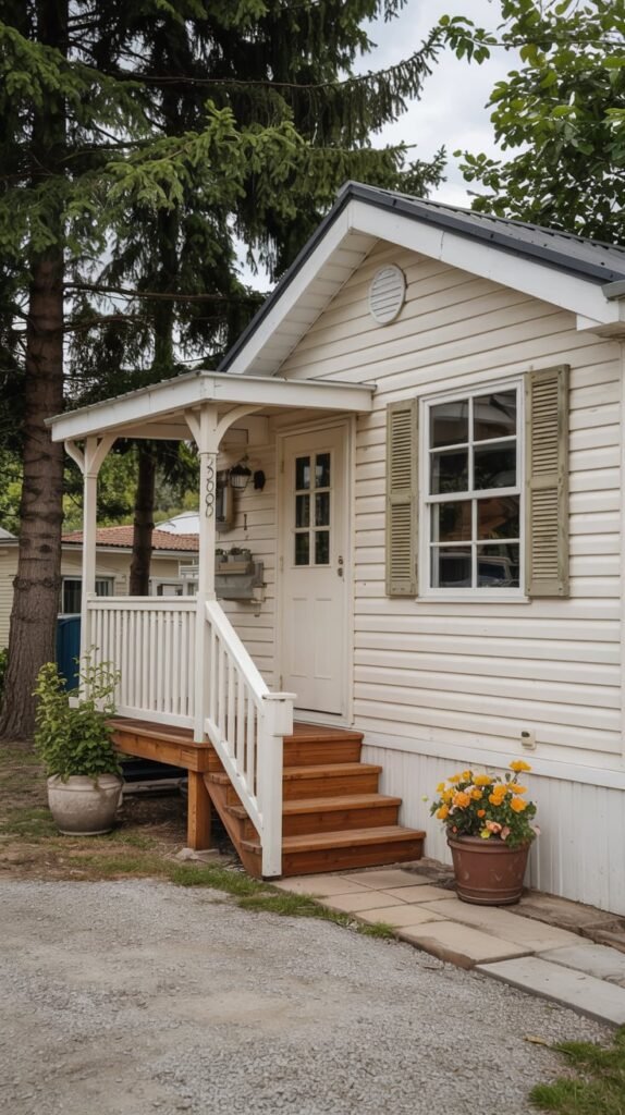 You can never go wrong with a crisp, classic white. It gives your mobile home a clean, timeless look that feels fresh and bright. I love how white makes a home appear larger and stands out beautifully against green landscaping.