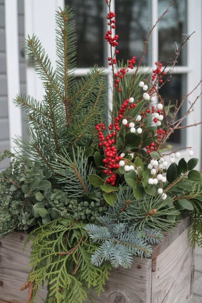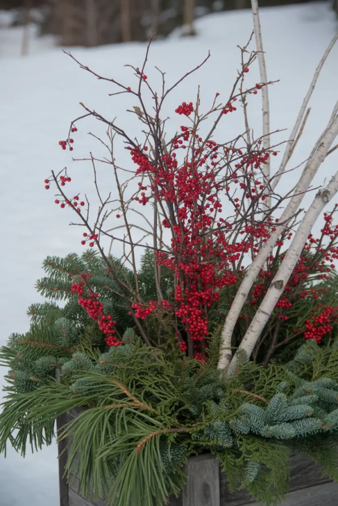 I refresh these planters midway through winter by adding berry branches or decorative elements. This keeps them looking fresh from November through March.