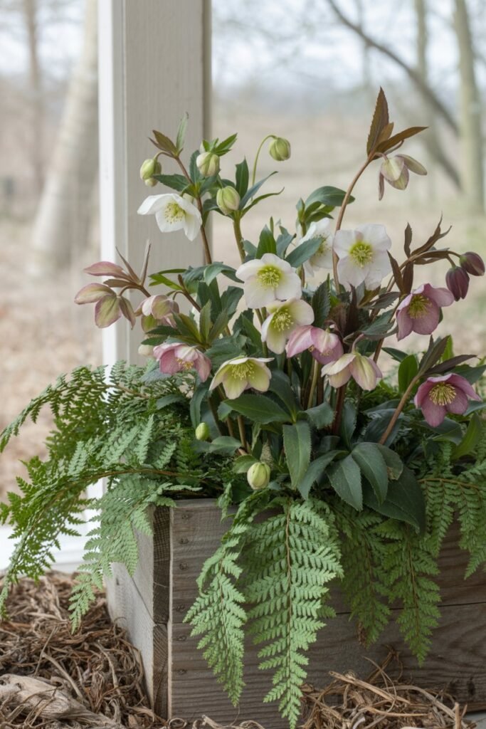 Hellebores, also called Christmas roses, bloom in late winter and are remarkably cold-hardy. I plant them with evergreen ferns to create lush, woodland-inspired planters.