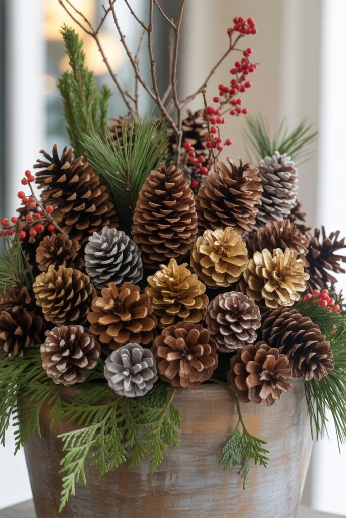I add sprigs of evergreen, berries, or decorative branches tucked among the pine cones. Sometimes I spray-paint a few cones gold or silver for a festive touch.