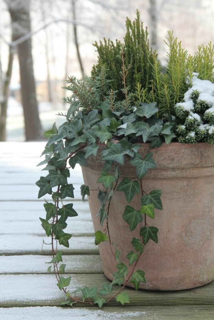 I use hardy English ivy as a trailing element in nearly all my winter planters. Its cascading habit softens container edges and adds graceful movement.