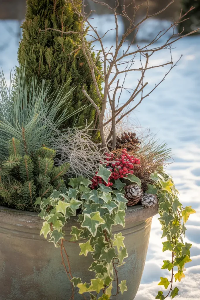 My favorite approach combines multiple textures in a single planter. I start with a tall evergreen as the thriller, add ornamental grasses or branches as filler, and finish with trailing ivy as spiller.