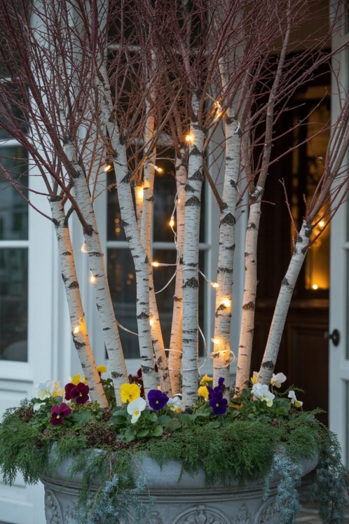 I arrange several branches vertically in the planter, then fill the base with evergreens or winter pansies. Sometimes I wrap battery-operated string lights around the branches for evening ambiance.