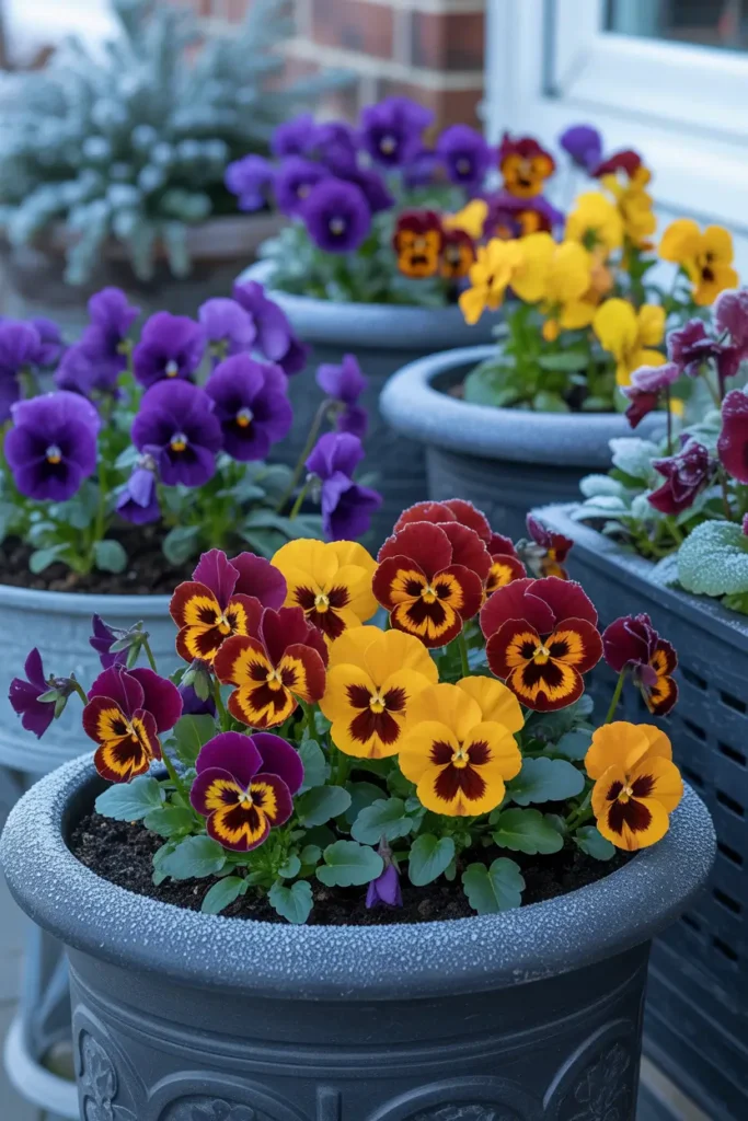 I plant them in layers, using different colors—deep purple, pink, and white varieties create stunning contrast. They can withstand temperatures down to 20°F and continue looking beautiful.