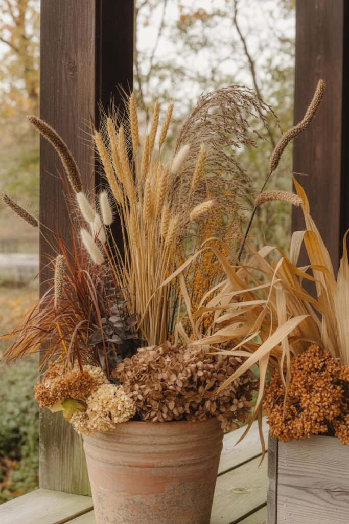 For a natural, harvest-inspired look, I fill planters with dried wheat stalks, ornamental grasses, and seed heads. This approach celebrates the beauty of the dormant season.