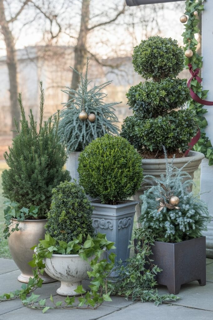 I create focal points with small evergreen topiaries planted in decorative containers. Boxwood, juniper, and dwarf Alberta spruce maintain their shape beautifully through winter.
