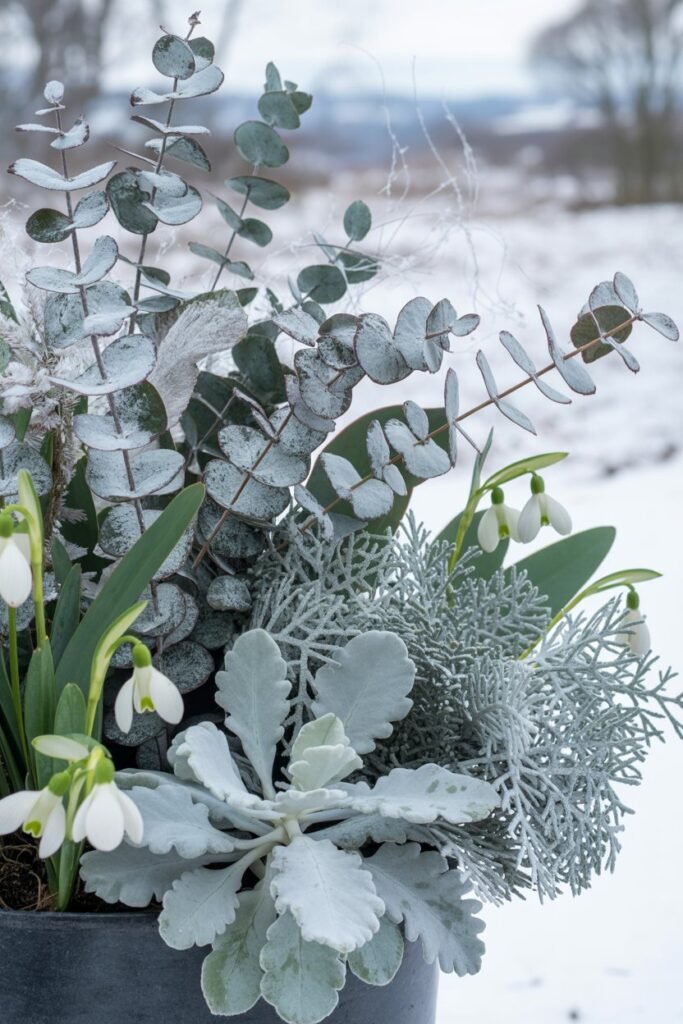 I’ve fallen in love with the silvery tones of preserved eucalyptus and dusty miller for winter planters. These cool colors complement snowy landscapes and create an elegant, sophisticated look.