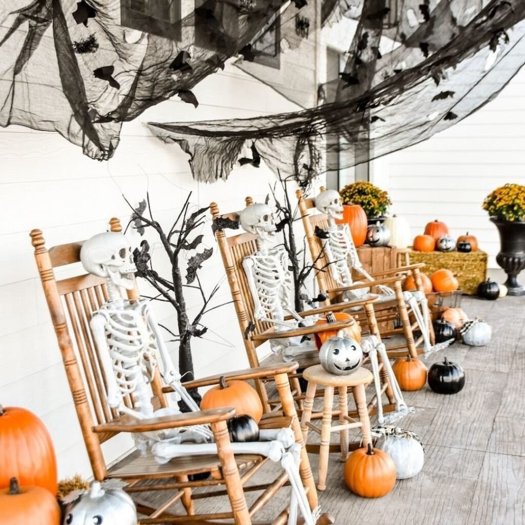 This fall halloween decor setup brings the undead to life with a playful twist. Two skeleton friends have claimed wooden rocking chairs as their eternal resting spots, creating an unexpectedly charming welcome committee. Black cheesecloth drapes overhead like ghostly curtains, while orange and white pumpkins scatter across the porch floor.