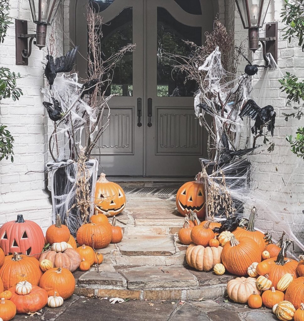 This dramatic entrance showcases how fall Halloween decor can transform an ordinary doorway into a haunting welcome. The carved jack-o’-lanterns grin menacingly among a sea of orange pumpkins, while black ravens perch ominously on twisted branches wrapped in ghostly cobwebs.