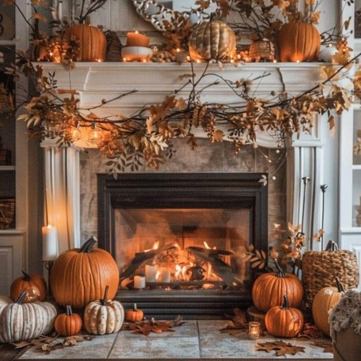 This fireplace mantel demonstrates how fall Halloween decor can feel warm rather than frightening. Golden string lights weave through dried branches and autumn leaves, creating an enchanting glow that makes the space feel inviting. The arrangement balances orange pumpkins with neutral gourds for sophisticated seasonal style.