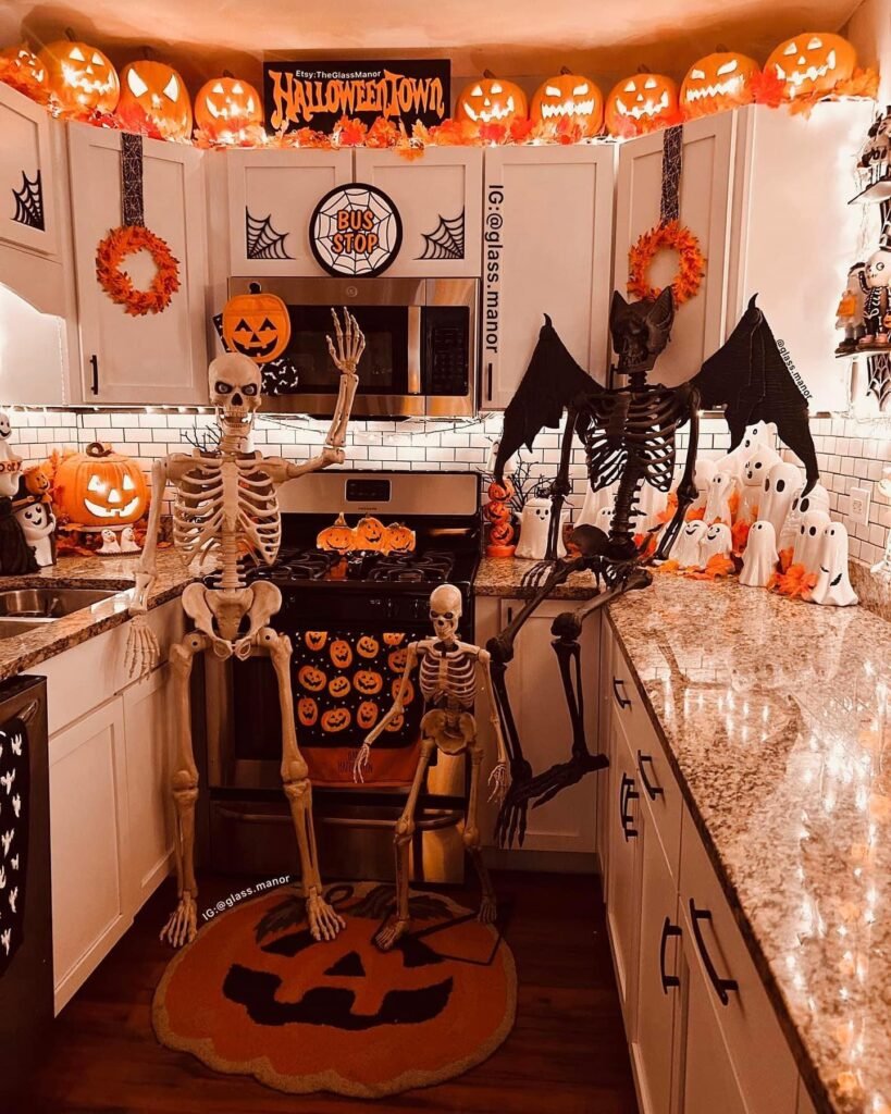 This kitchen proves that fall Halloween decor can invade every corner of your home. Skeleton figures pose playfully among the cookware while jack-o’-lantern garland drapes across the cabinets. The orange and black color scheme creates cohesive spooky fun throughout the space.