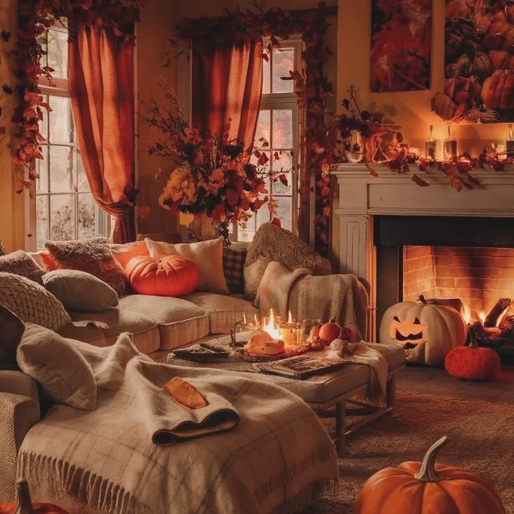 The room balances comfort with seasonal celebration. Textured throw blankets invite snuggling during chilly October evenings. Candles provide ambient lighting that flatters both the decor and the occupants. Fresh autumn leaves scattered naturally complete the harvest theme.
