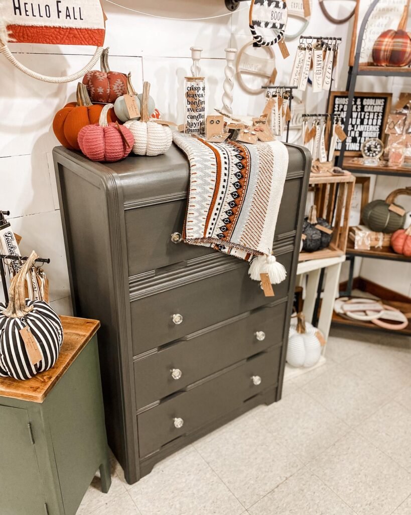 This styling demonstrates restraint and intention. Each piece serves a purpose, whether adding color, texture, or seasonal symbolism. The vertical “FALL” sign draws the eye upward, while smaller elements fill gaps naturally. Orange accents tie everything together without dominating the palette, showing how effective fall halloween decor can be when it celebrates the season’s natural beauty alongside spooky elements.