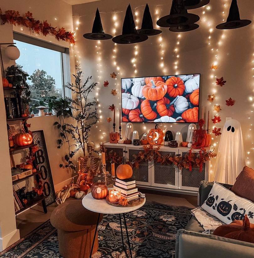 This living space demonstrates how fall Halloween decor can transform an entire room into a magical autumn wonderland. Witch hats dangle from sparkling string lights while autumn leaves cascade down the walls like nature’s confetti. The warm glow creates an inviting atmosphere that balances spooky charm with cozy comfort.
