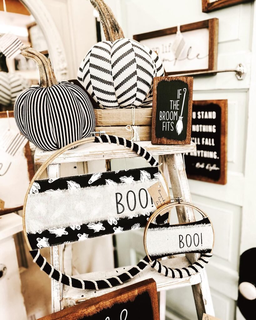 This tiered display showcases how fall Halloween decor can embrace modern farmhouse aesthetics with monochrome magic. Black and white striped pumpkins create visual drama against weathered wood, while playful “BOO!” signs add friendly spookiness without overwhelming the neutral palette.