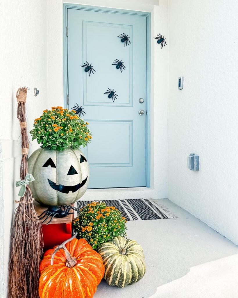 Clean lines meet creepy crawlies in this sophisticated fall halloween decor approach. The soft blue door serves as an unexpected backdrop, making black plastic spiders pop dramatically. These eight-legged invaders appear to be taking over the entrance, creating instant curb appeal with minimal effort.