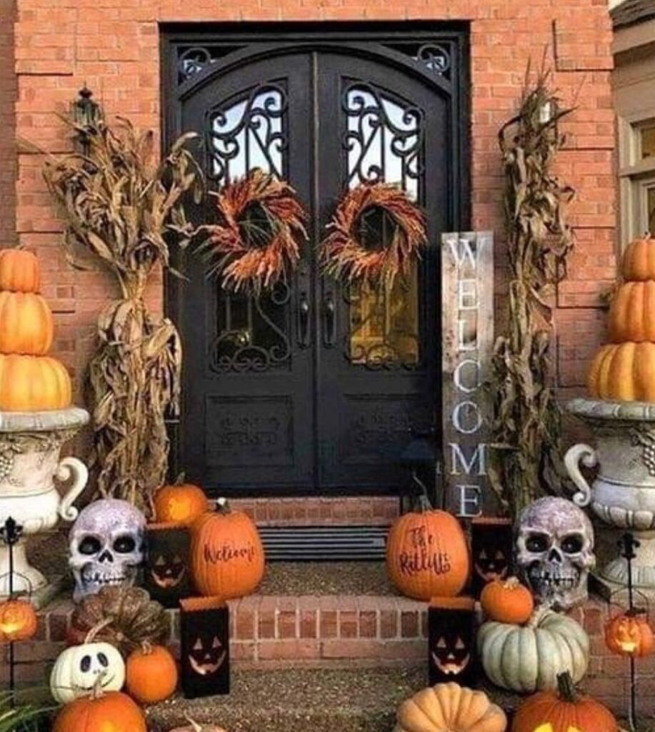 This approach succeeds through repetition and symmetry. Every element on the left finds its match on the right, creating visual harmony despite the abundance of decorations. The corn stalks add movement and texture, while pumpkins provide classic fall color. Even the skull accessories feel festive rather than frightening, making this fall halloween decor suitable for families with varying spook tolerances.