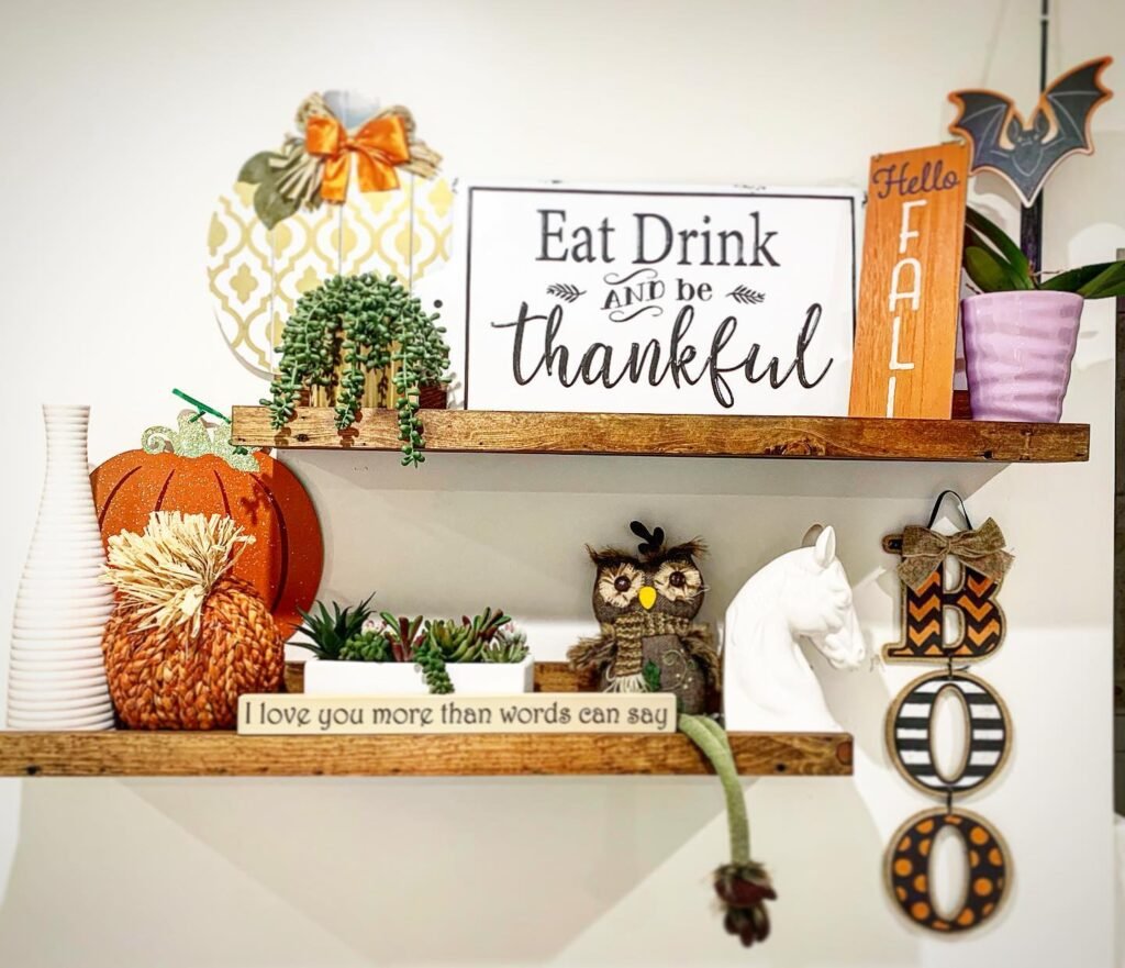 Indoor fall halloween decor reaches new heights on this beautifully styled floating shelf display. The “Eat Drink and be thankful” sign anchors the arrangement, setting a grateful tone for the season. Mixed textures create visual interest without overwhelming the clean white backdrop.
