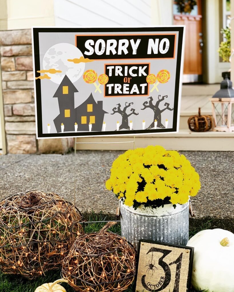 This approach works because it doesn’t apologize for setting boundaries. Instead, it celebrates the season while communicating clearly. The professional sign design elevated beyond a simple “No” message, incorporating classic Halloween imagery that neighbors can appreciate even if they can’t participate. Strategic placement among other fall halloween decor elements makes it feel integrated rather than isolating.