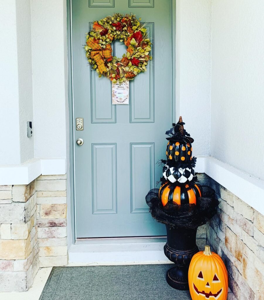 This fall halloween decor masterpiece showcases sophisticated seasonal styling at its finest. A lush autumn wreath bursts with golden leaves and plaid ribbon, creating instant warmth against the sage green door. The real showstopper sits below – a dramatic three-tier pumpkin topiary that commands attention.