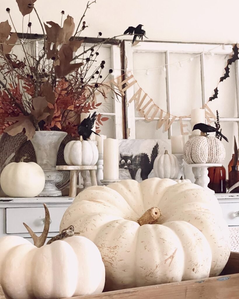 Creamy white pumpkins create a stunning foundation for this sophisticated fall halloween decor display. The monochromatic approach feels fresh and modern while honoring autumn traditions. Dried foliage in muted tones adds natural texture without overwhelming the peaceful palette.