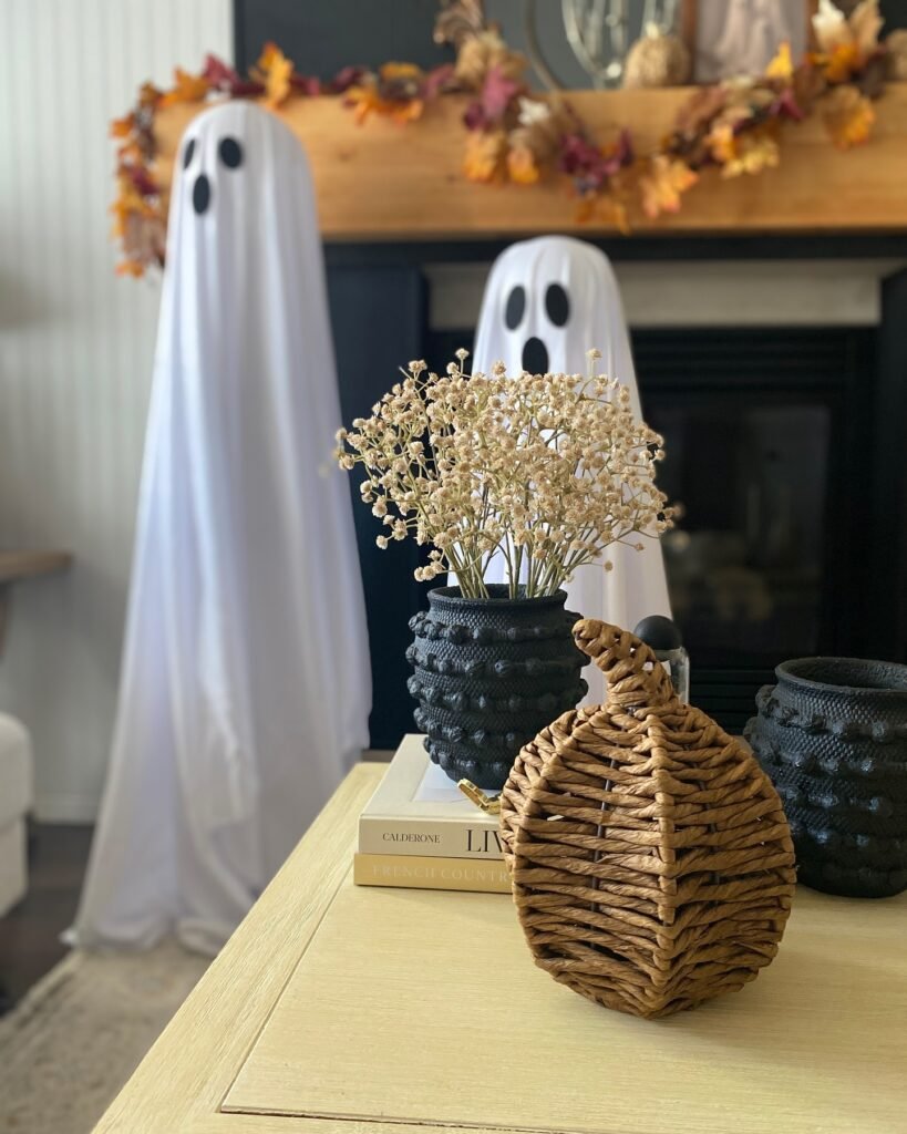 Simple white sheets transform into charming spirits in this approachable fall halloween decor idea. Two friendly ghosts hover near the fireplace, bringing whimsical Halloween magic indoors. Their innocent expressions make this display family-friendly while maintaining seasonal charm.