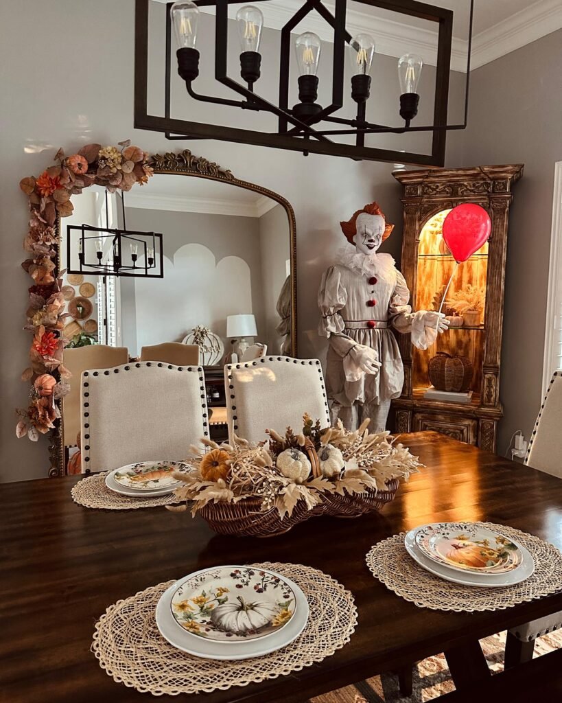Bold fall halloween decor takes center stage in this dramatic dining room display. The life-sized Pennywise figure creates an unforgettable focal point that guests will remember long after dinner ends. Autumn garland frames the mirror, softening the scary clown’s impact with natural beauty.